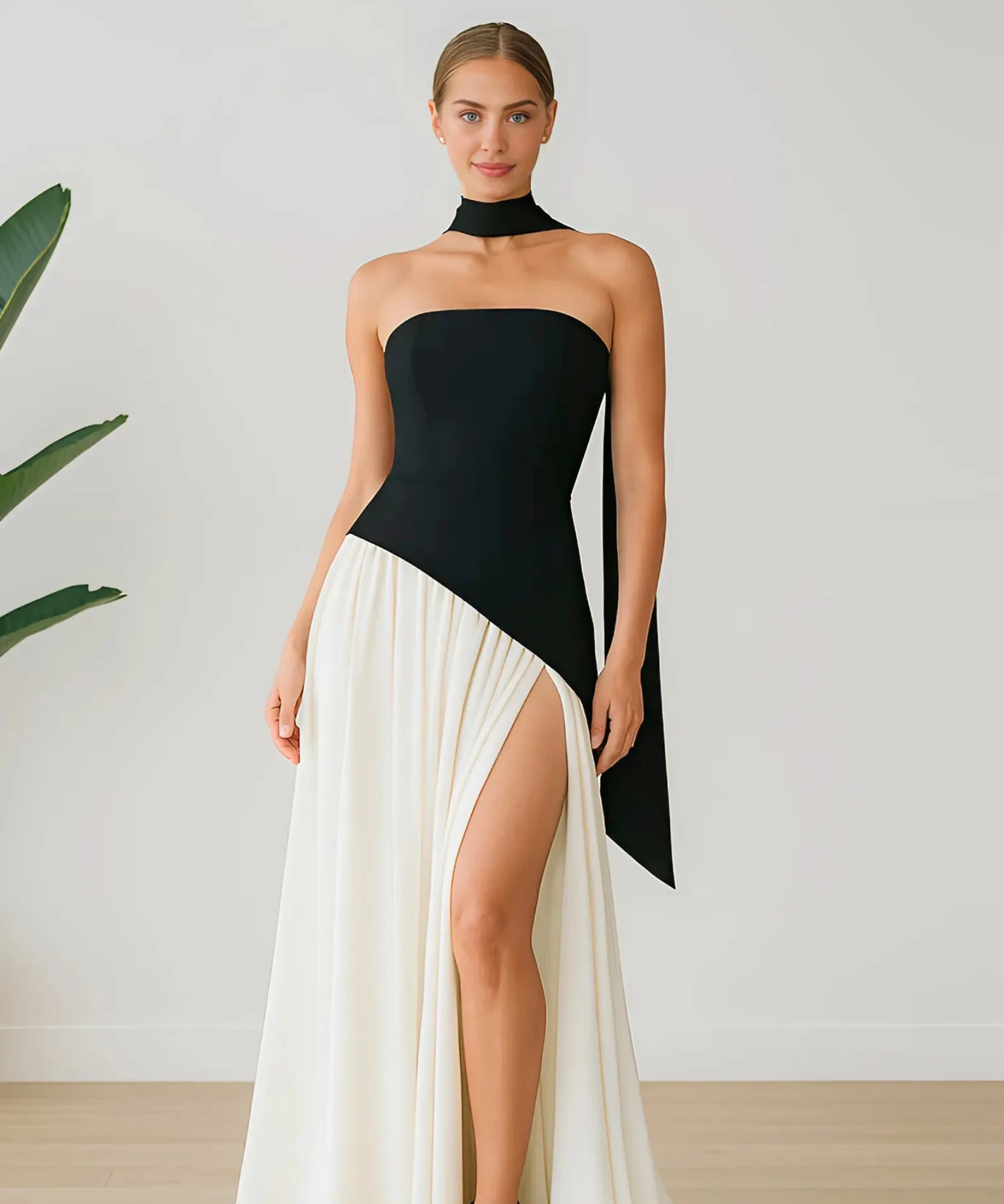 The Maliyah Maxi Dress is the ultimate embodiment of modern sophistication and bold style. With its strapless black top and flowing white skirt, it creates a striking contrast that demands attention. The dress features a daring thigh-high slit and a chic choker neckline, offering an edgy yet graceful silhouette. Perfect for formal occasions, gala events, or a night out, this dress is designed to make a memorable impression.