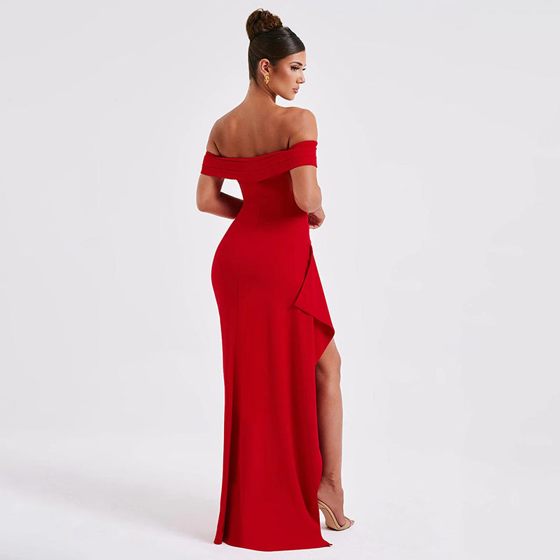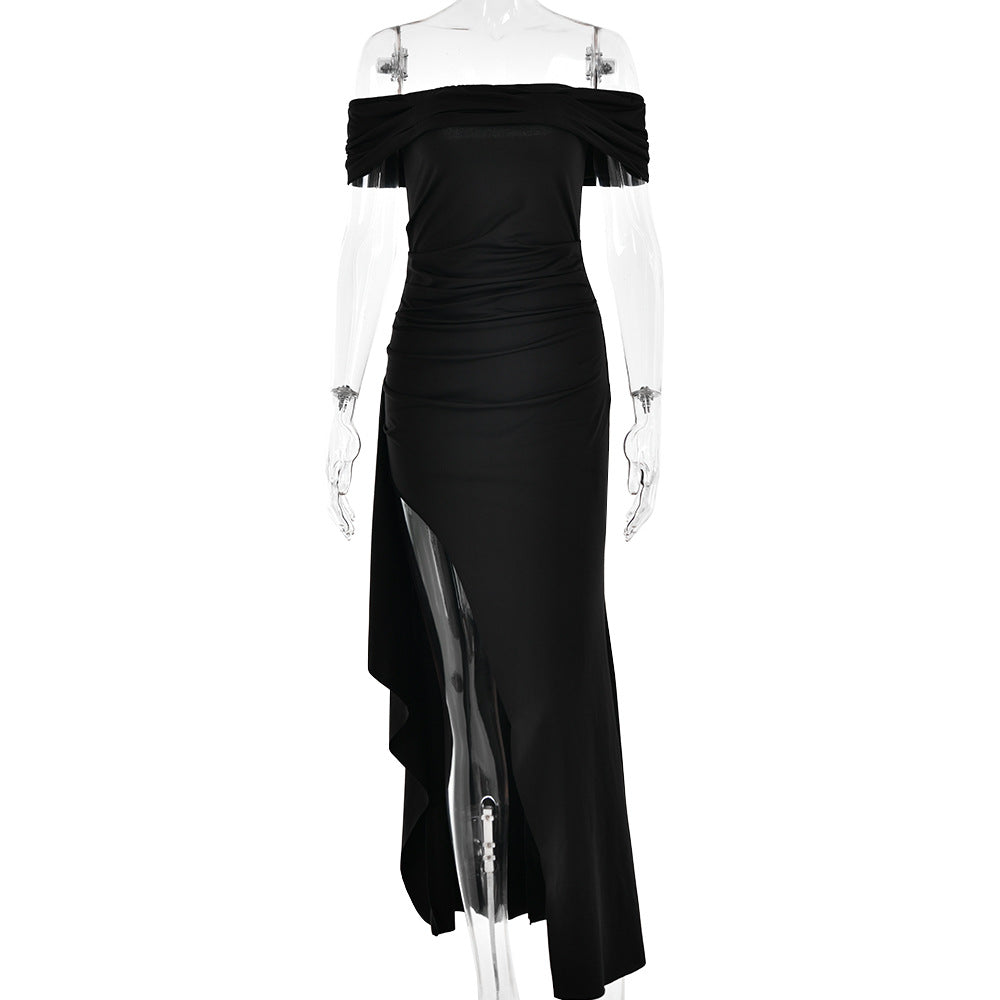 The pleated bardot neckline gracefully frames the shoulders and collarbone, adding a touch of refined charm. Designed with asymmetrical pleating at the waist, this dress creates a flattering silhouette that enhances your natural curves. The draped thigh-high slit adds a hint of sultry allure, ensuring a captivating presence with every step.